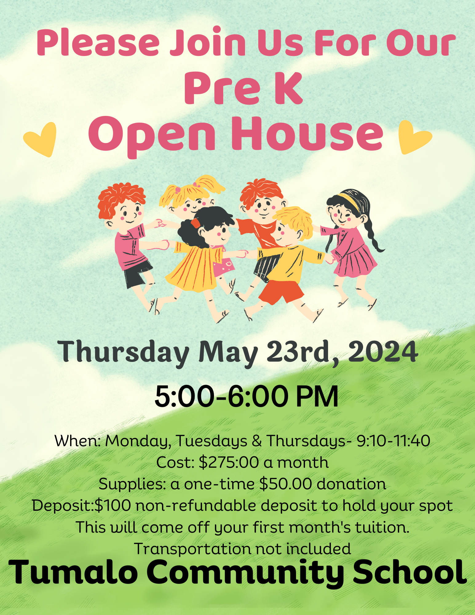 Mon, Tue, Thur, & Fri:K-5th grades 8:45-3:25 pm