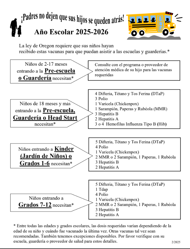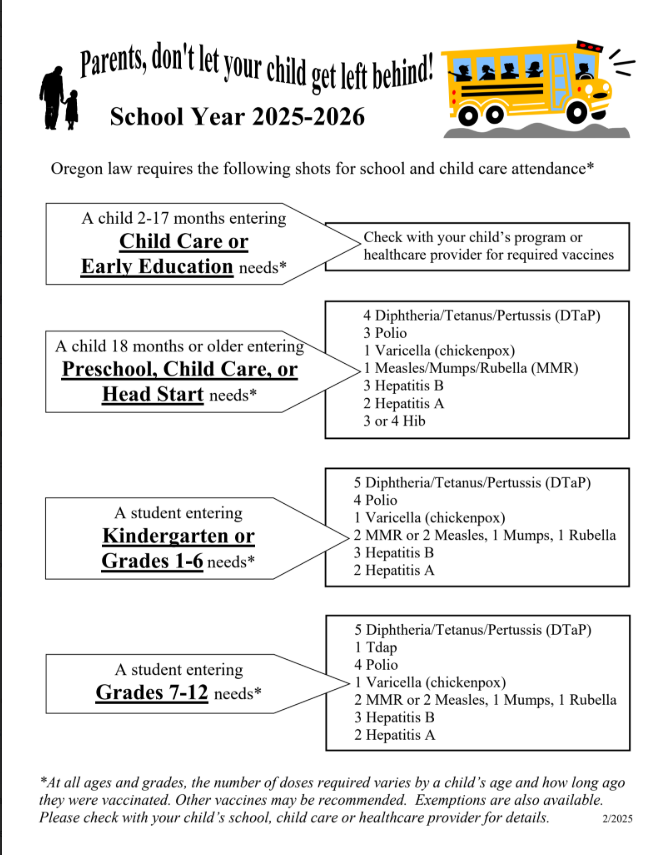I would also like to take the opportunity for my annual reminder to be sure your child’s immunizations are up-to-date. Please view the attached flyer for Oregon’s immunization requirements. The exclusion date for students who do not have their immunizations is in February, but I am always so surprised at how quickly it arrives! I am always happy to answer questions about Oregon requirements, help you with tracking down records, or assist you with what is needed to complete a non-medical exemption.