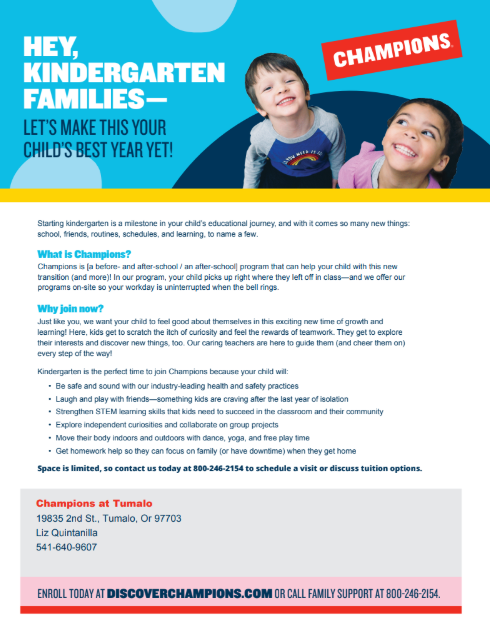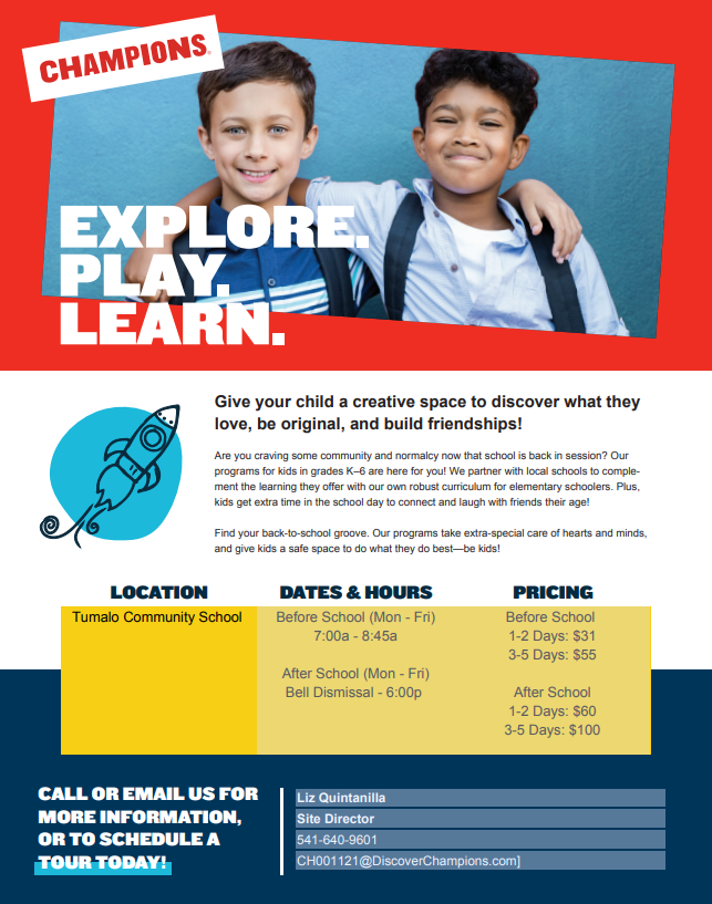 Happy Autumn, Tumalo Tigers! I hope you are all enjoying the change to the season. As always, now that we are all back together, we are seeing an uptick in respiratory illnesses. Please remind your children that one of the best ways to prevent spreading illness is by using good hand hygiene. This is an easy task that can be practiced at home as well as at school. The district recently shared flyers on when to keep your child home if they are sick. A few important things to note are that students who have had a fever can return to school when they have been fever- free for 24 hrs without fever reducing medication, and students who have vomited or had diarrhea must stay home from school for a full 24 hours once symptoms have resolved.