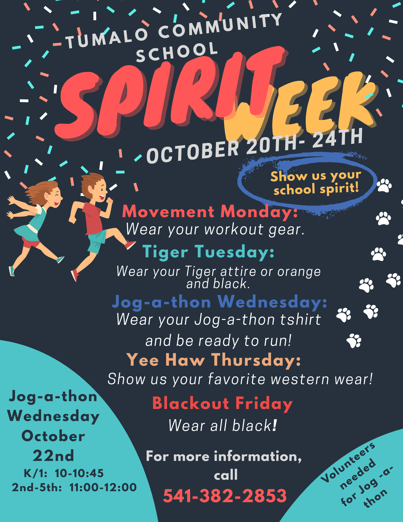 Coming up: Jog-a-thon!!! October 22nd! This is a very fun day and a wonderful fundraiser for our school! Times: K/1: 10-10:45 2nd-5th: 11:00-12:00